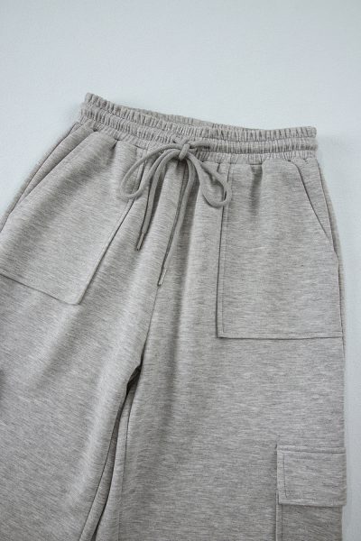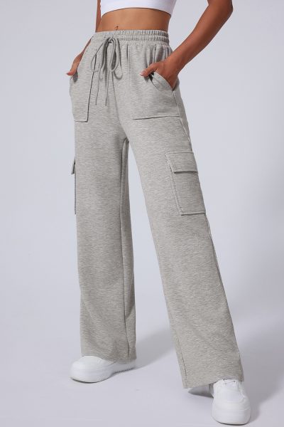 Light Grey Multi Pockets Lace-up High Waist Wide Leg Workout Pants