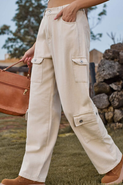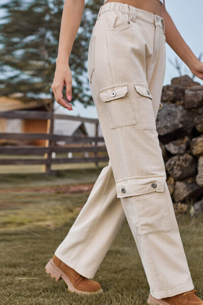 Light Khaki Asymmetric Pocket Denim Cargo Pants with Semi-Elastic Waist