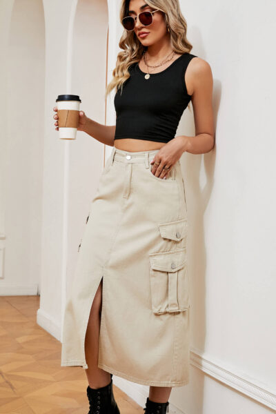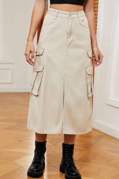 Light khaki Color Casual Denim Cargo Midi Skirt with Dual Side Pockets