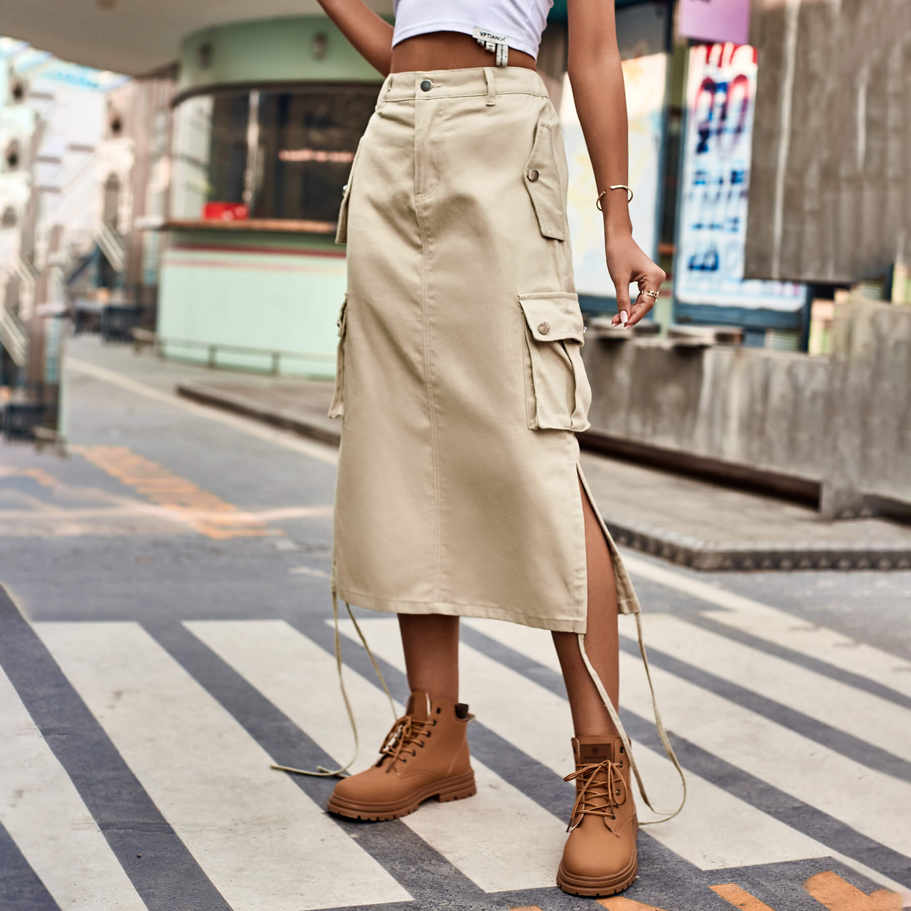Light khaki Color Denim Utility Midi Skirt with Dual Side Ties