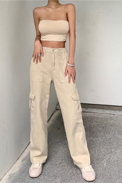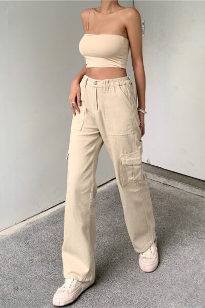 Light khaki Denim Cargo Pants with Elastic Waist Design