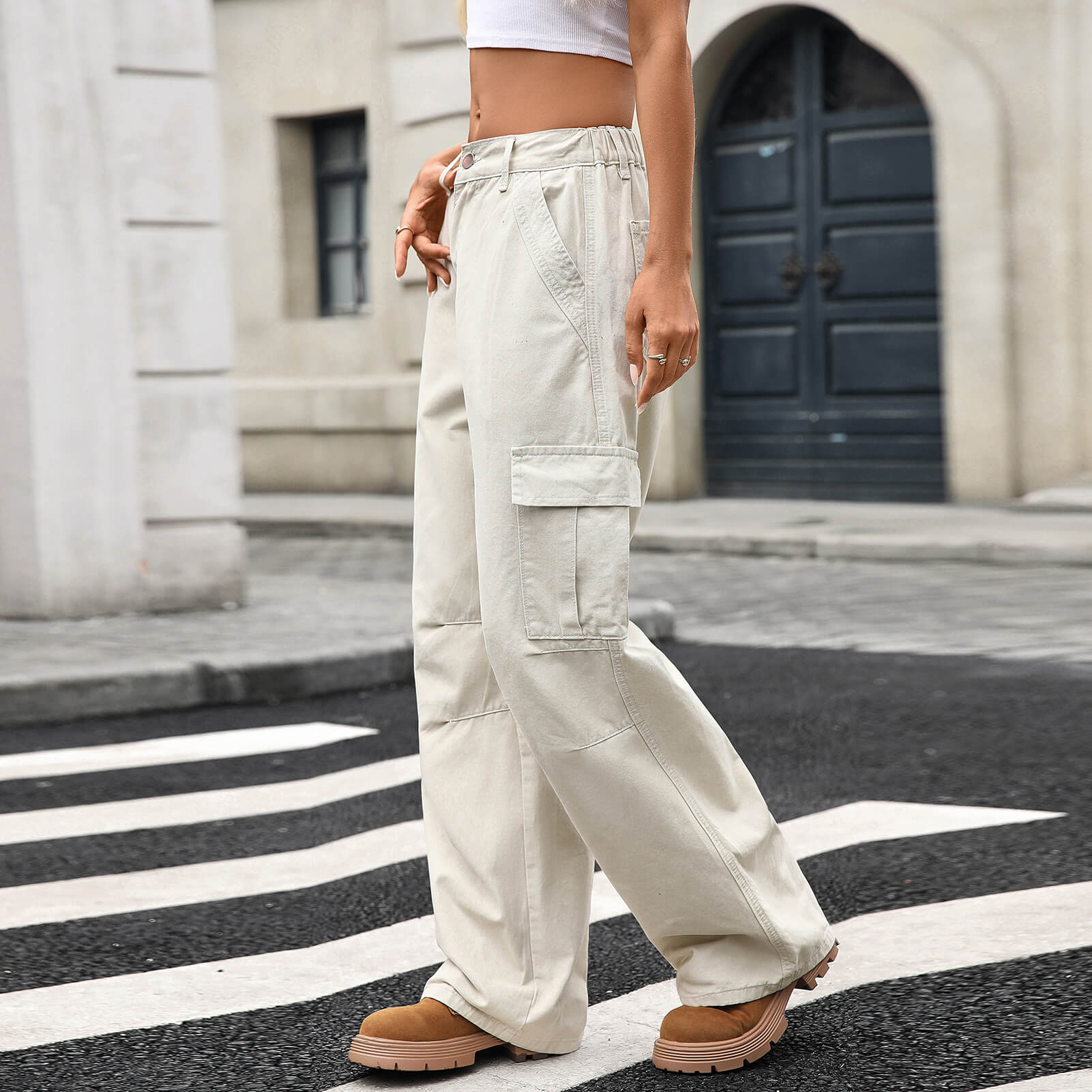 Light khaki Loose Fit Denim Cargo Pants with Large Side Pockets