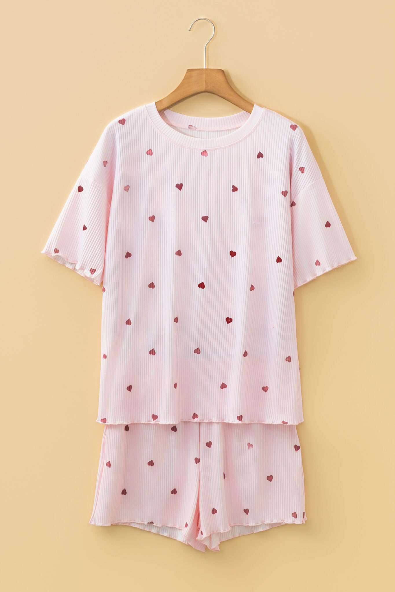 Light Pink Valentine Heart Shape Print Ribbed Knit Short Lounge Set