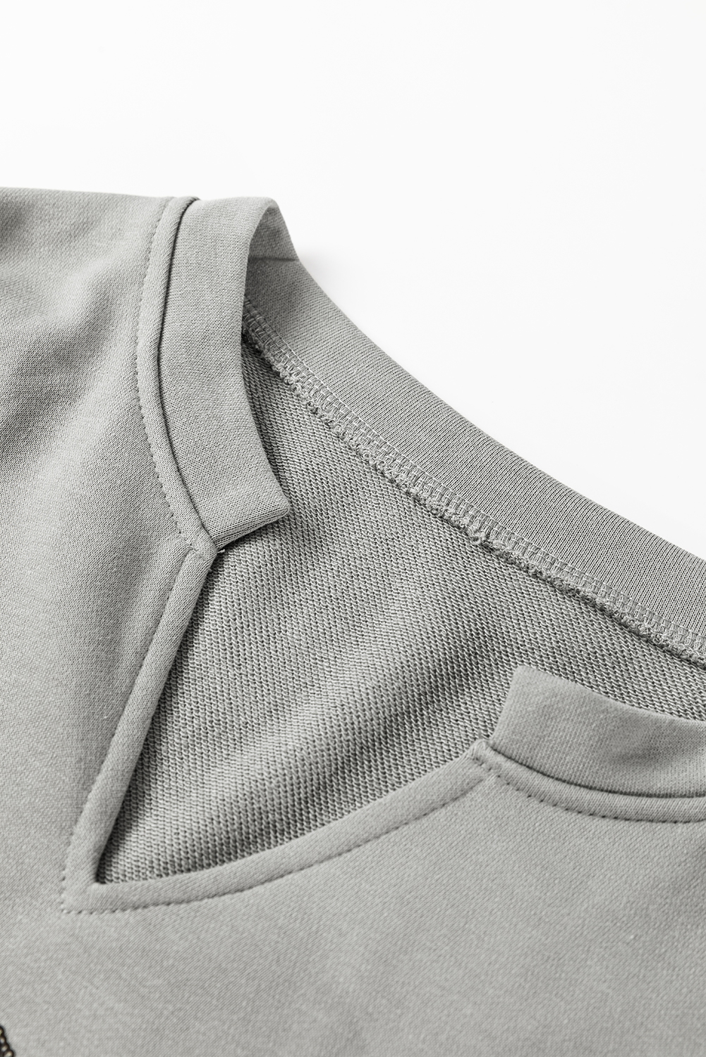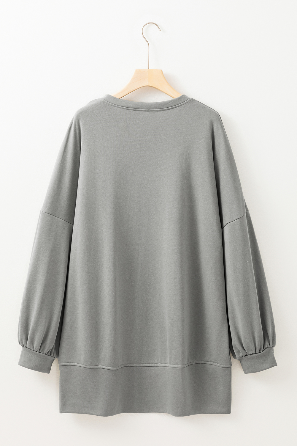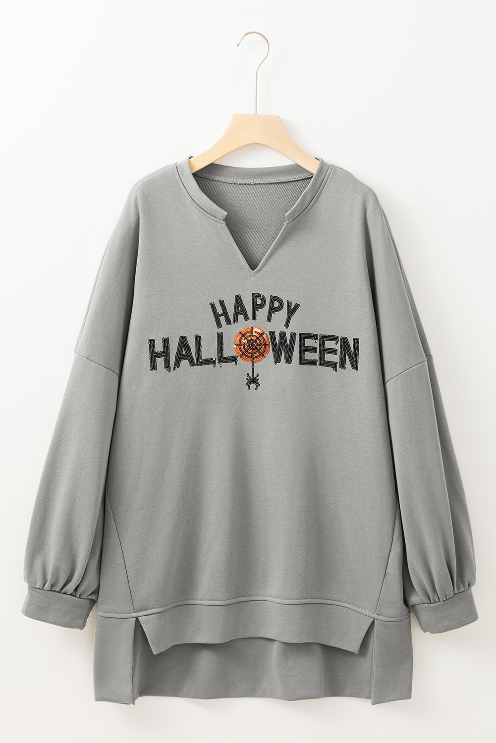 Medium Grey Sequin Happy Halloween Graphic Notched Neck Long Sleeve Loose Top