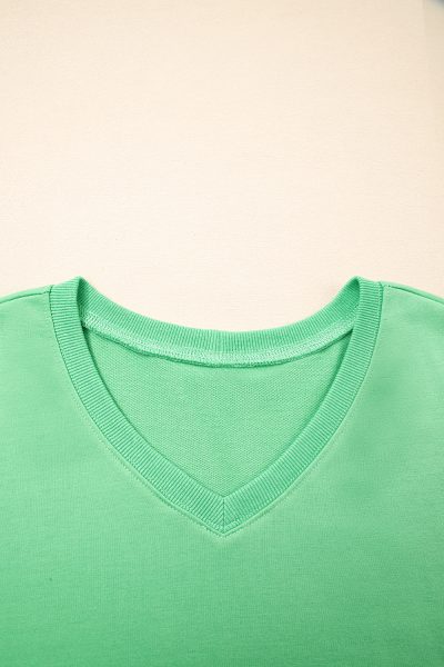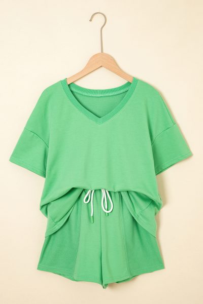 Mint Green V Neck Drop Shoulder Tee and Patchwork Drawstring Shorts Set