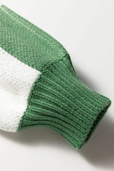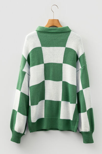 Mist Green Checkered Pattern Polo Collar Loose Sweater