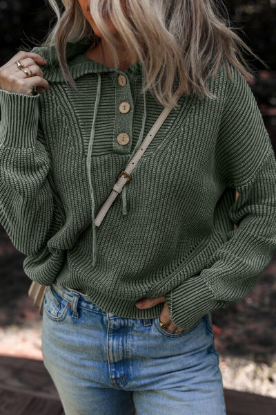 Mist Green Mineral Wash Ribbed Knit Button Drawstring Neck Hooded Sweater