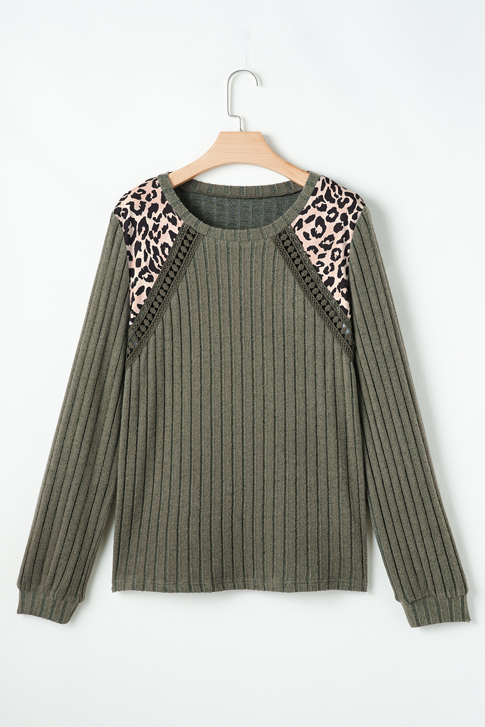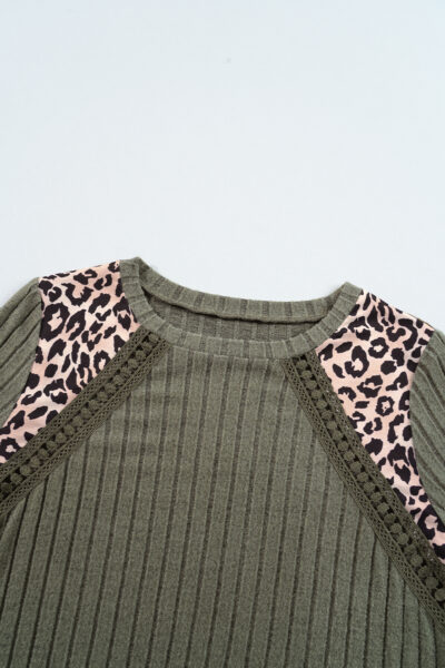 Moss Green Leopard Print Crochet Patchwork Rib Textured Knit Top