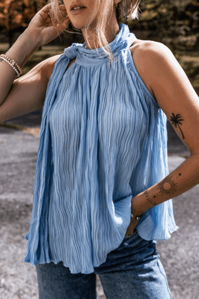 Myosotis Textured Pleated Tied Mock Neck Flowy Tank Top