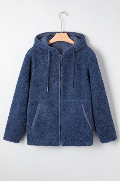 Navy Blue Fleece Zip Up Drawstring Hooded Pocketed Jacket