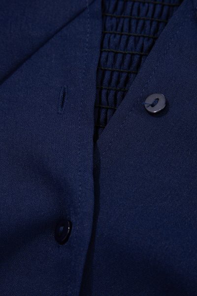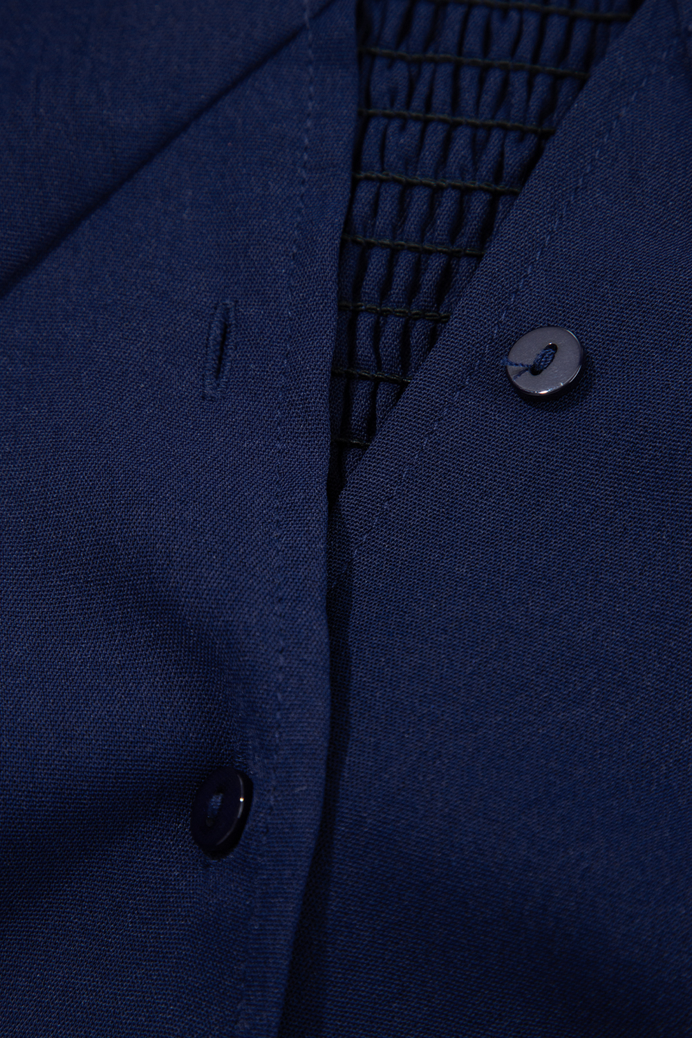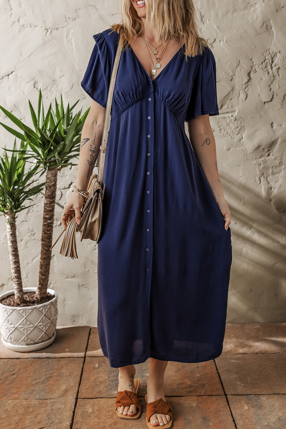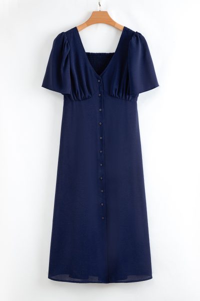 Navy Blue V Neck Buttoned Front Shirred Back Short Sleeve Midi Dress