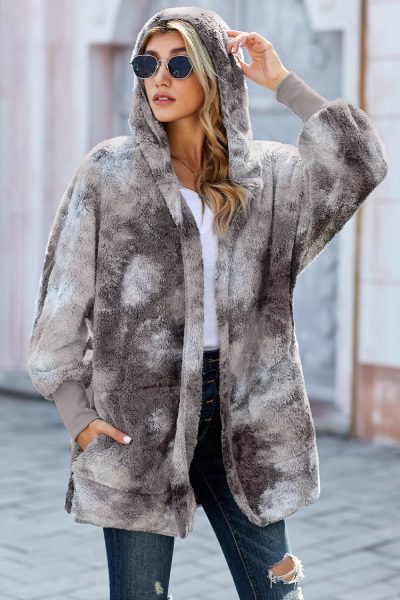 Nora Womens Tie Dye Soft Fleece Hooded Open Front Coat Gray