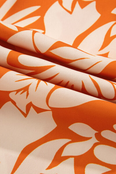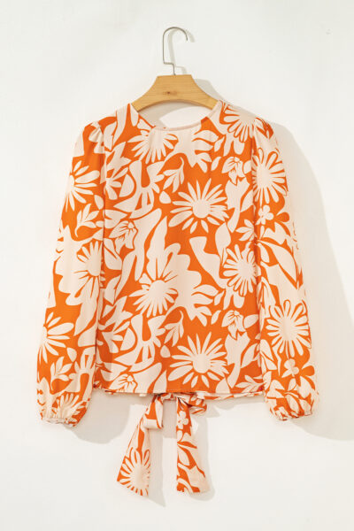 Orange Floral Print Knotted Open Back Long Sleeve Blouse