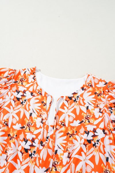 Orange Floral Print Split V Neck Bubble Sleeve Plus Size Midi Dress
