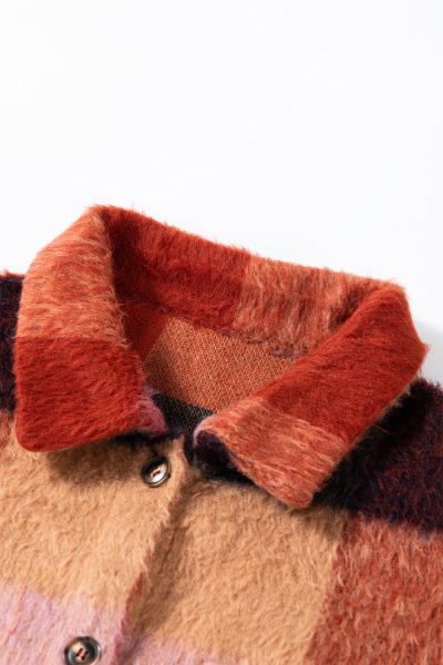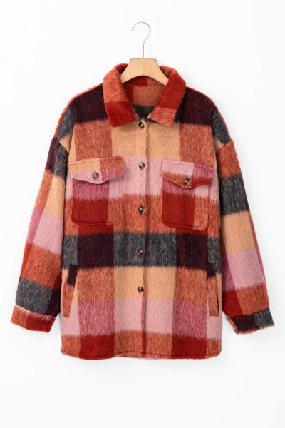 Orange Plaid Print Flap Pockets Buttoned Casual Plus Size Jacket