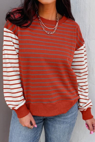 Orange Stripe Contrast Sleeve Patchwork Drop Shoulder Long Sleeve Sweatshirt