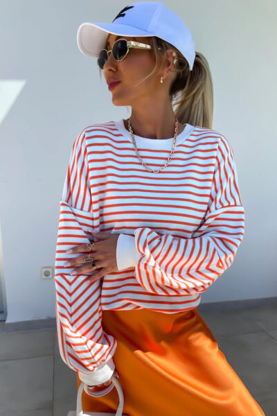 Orange Stripe Drop Shoulder Crew Neck Loose Sweatshirt