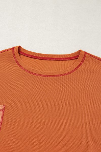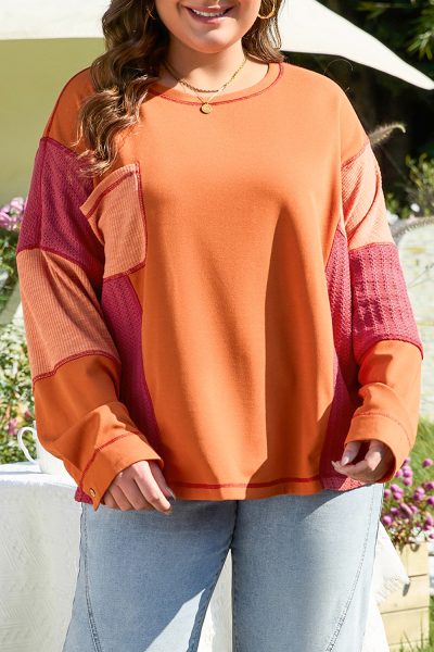 Orange Textured Knit Color Block Patchwork Chest Pocket Plus Size Top