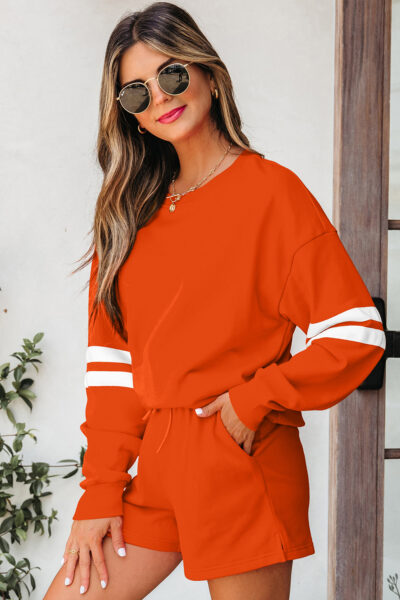 Orange Varsity Striped Sleeve Drop Shoulder Sweatshirt and Short Set