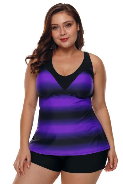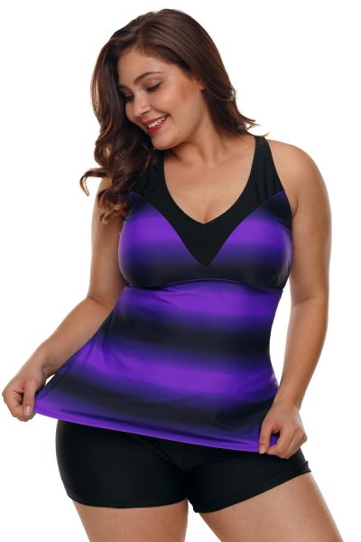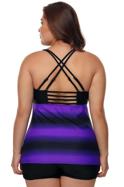 Ossie Womens Criss Cross Purple Back Color Block Print Tankini Top with Boyshorts Swimsuit