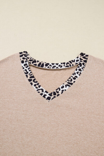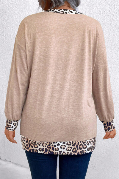 Parchment Leopard Patchwork V Neck Long Sleeve Plus Size Top