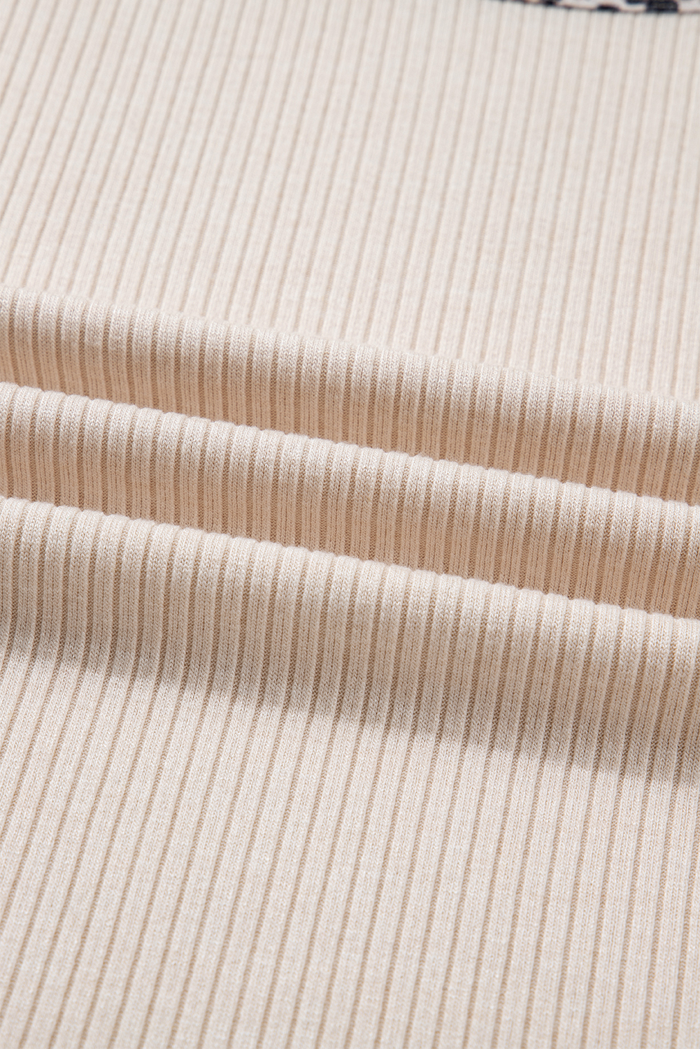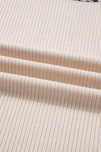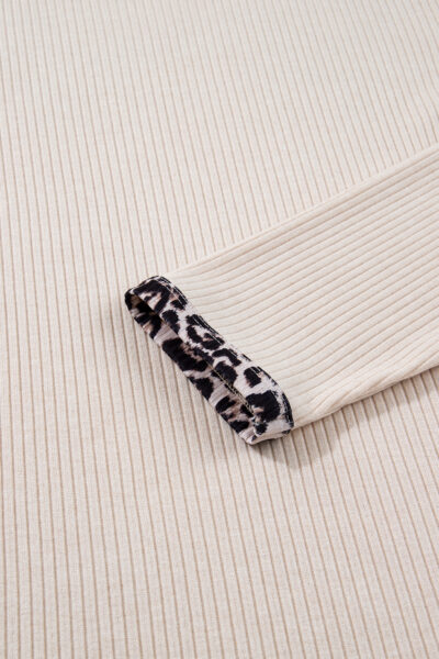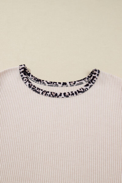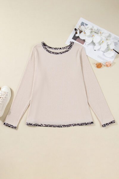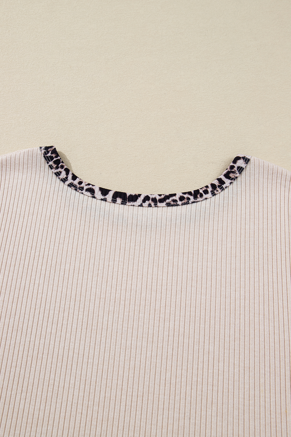 Parchment Ribbed Contrast Leopard Edge Round Neck Plus Knit Top