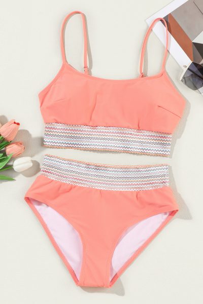 Peach Blossom Striped Patchwork Spaghetti Strap High Waist Bikini Swimsuit