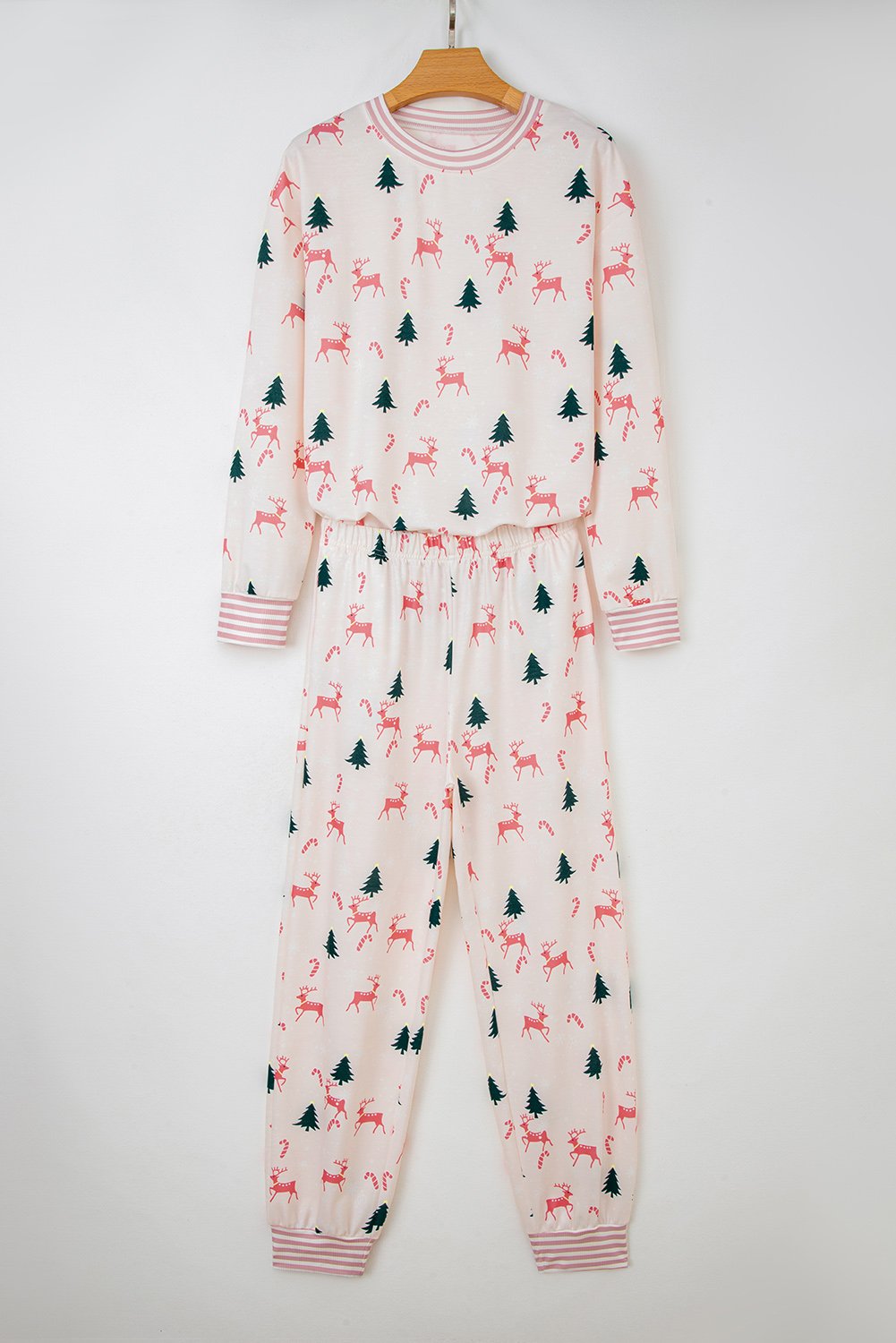 Pink Bow Christmas Tree Print Contrast Striped Banding 2pcs Lounge Set