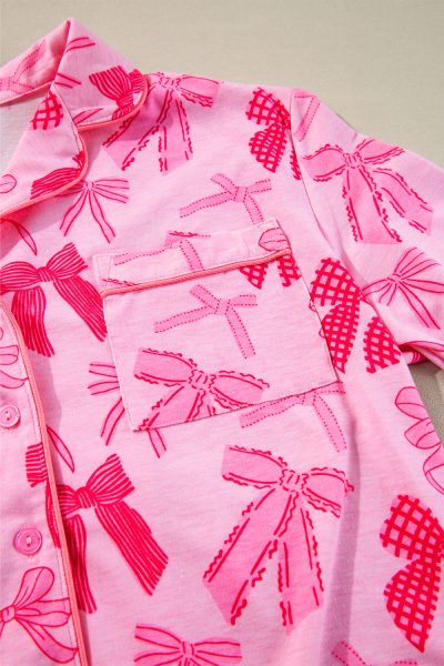 Pink Bow Knot Print Lapel Collar Short Sleeve and Pants Pajamas Set
