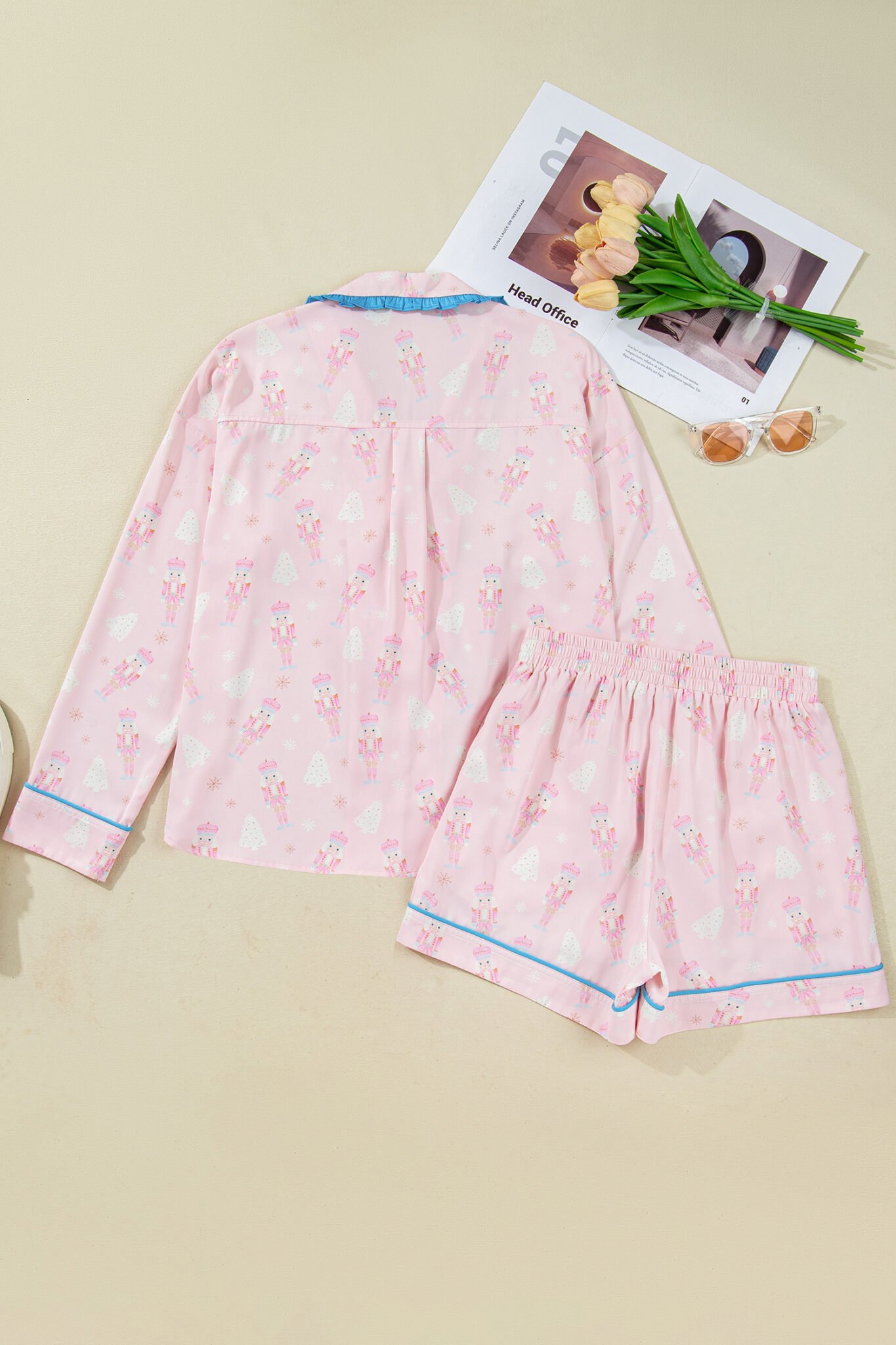 Pink Bow Tie Front Christmas Nutcracker Long Sleeve Shirt Shorts Pajama Set