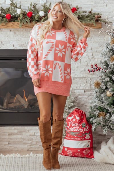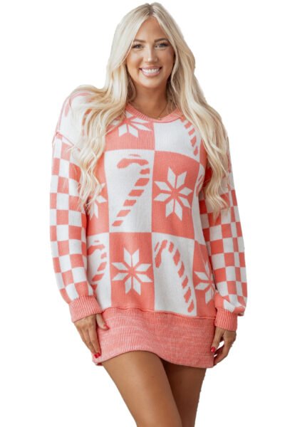 Pink Candycane Snowflake Checker Christmas Holiday Drop Shoulder Tunic Loose Sweater