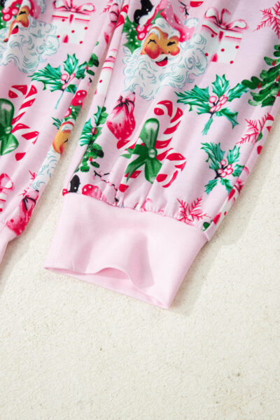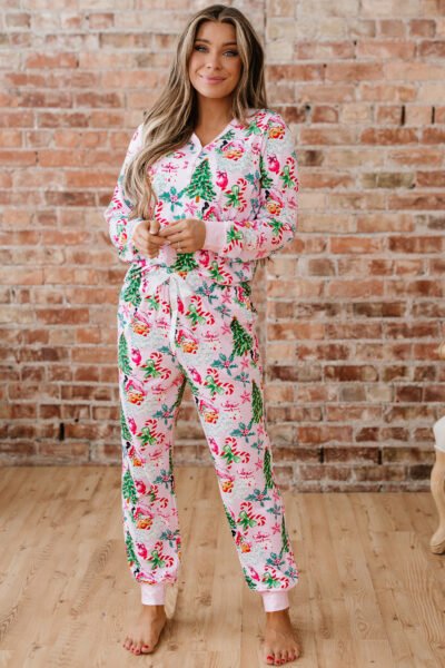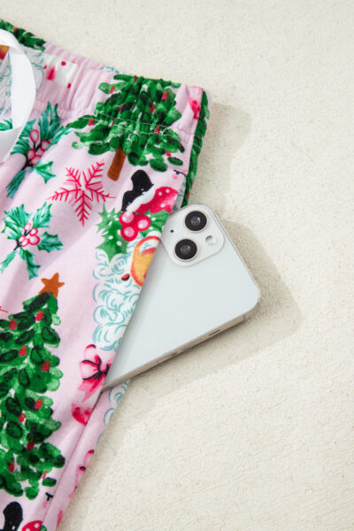 Pink Christmas Pattern Button V Neck Pullover Drawstring Pants 2pcs Lounge Set