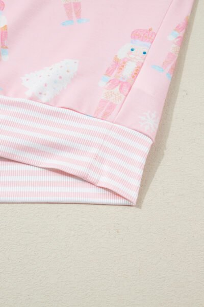 Pink Christmas Tree Nutcracker Doll Print Contrast Trim Long Sleeve Top Matching Shorts Set