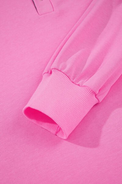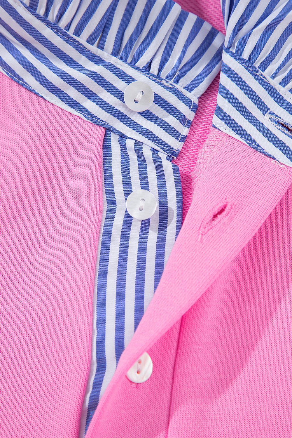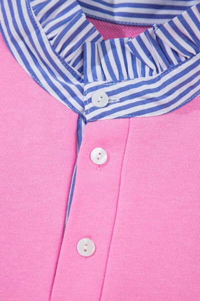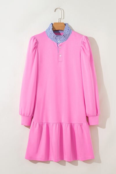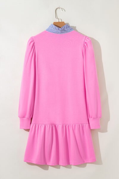 Pink Contrast Striped Collar Patchwork Puff Sleeve Ruffle Hem Mini Dress