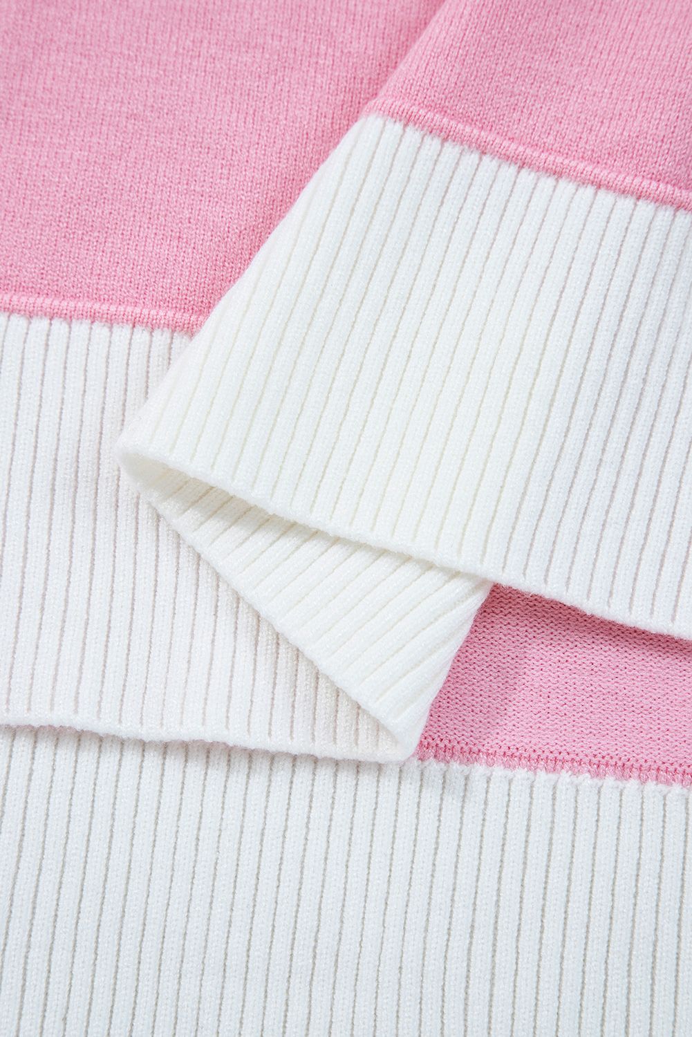 Pink Contrasting Polo Collar Color Block Knit Drop Shoulder Sweater