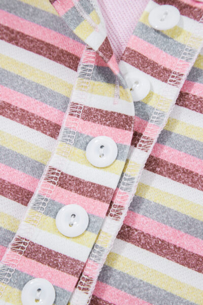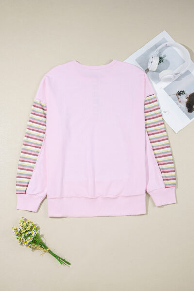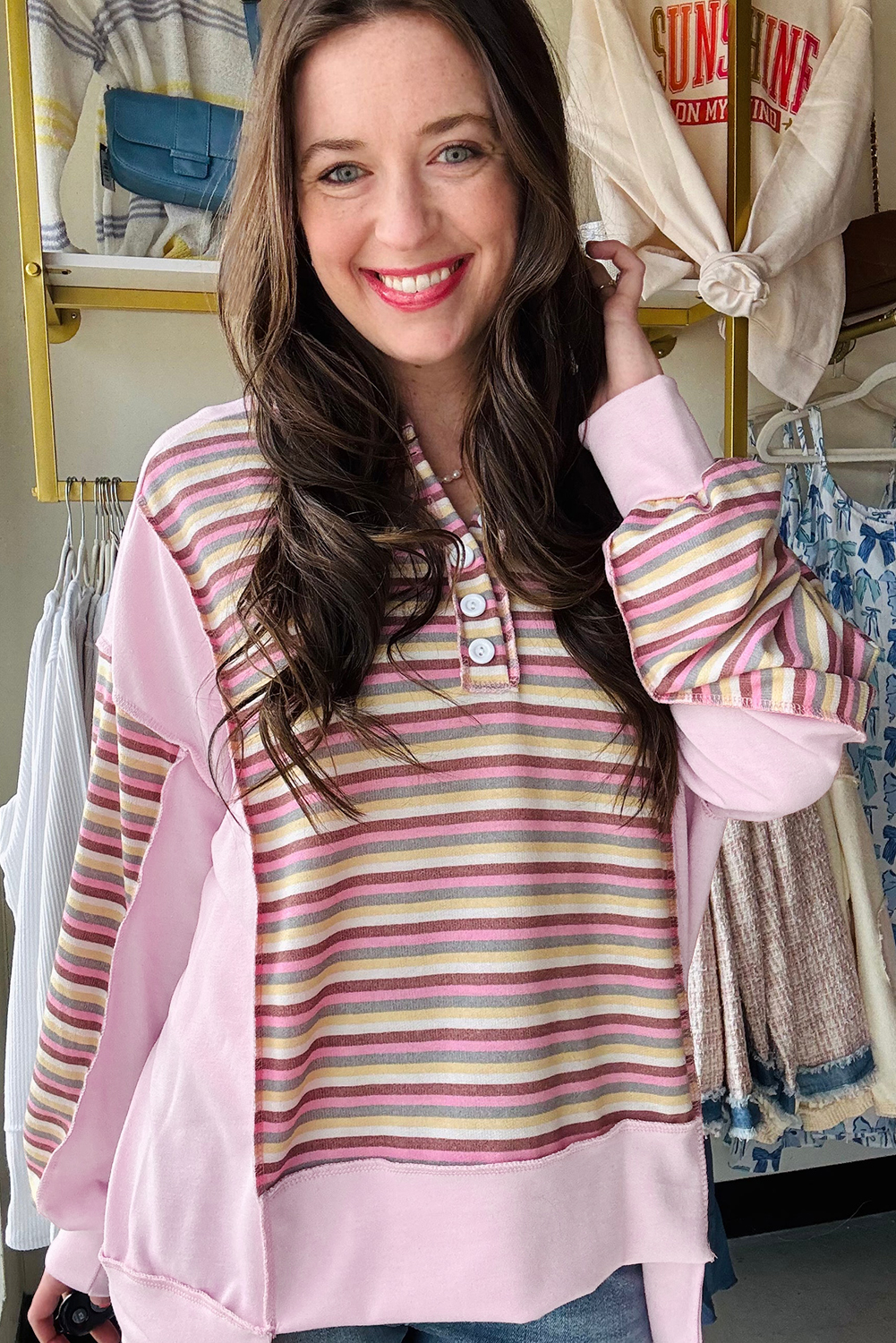 Pink Exposed Seam Color Block Striped Patchwork Loose Henley Sweatshirt