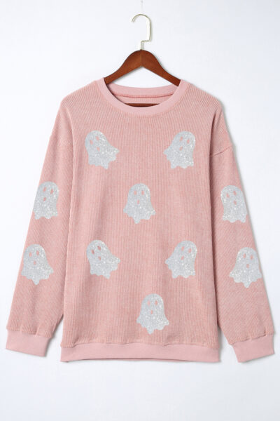 Pink Halloween Ghost Corded Crew Neck Loose Sweatshirt