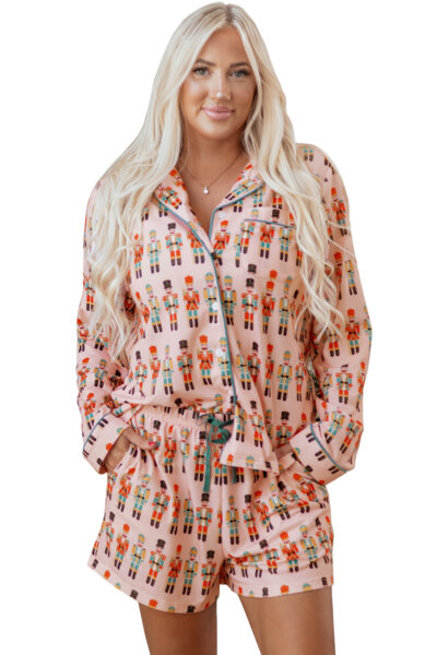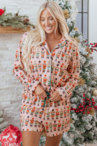 Pink Nutcracker March Long Sleeve Button Up 2pcs Pajama Short Set