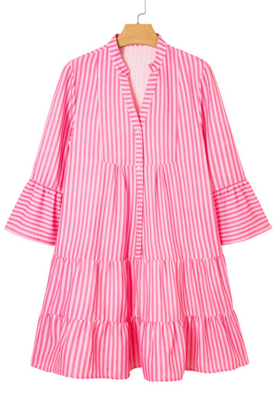 Pink Stripe Flare Sleeve Half Placket Tiered Flowy Mini Dress