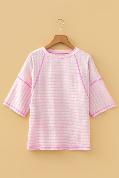 Pink Stripe Textured Knit Split Hem Half Sleeve Loose Top