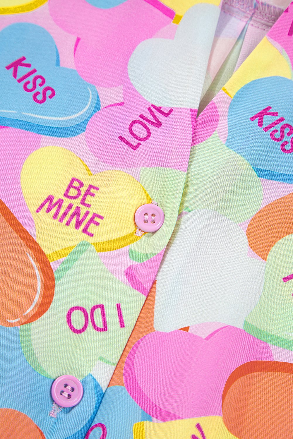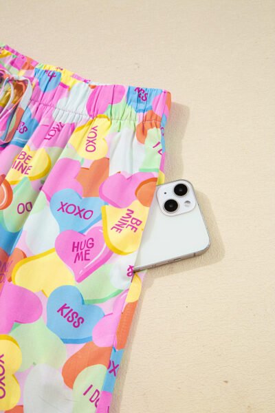 Pink Valentines Candy Heart V Neck Collared Tunic Shirt and Shorts 2pcs Pajama Set