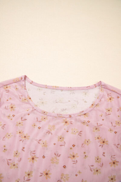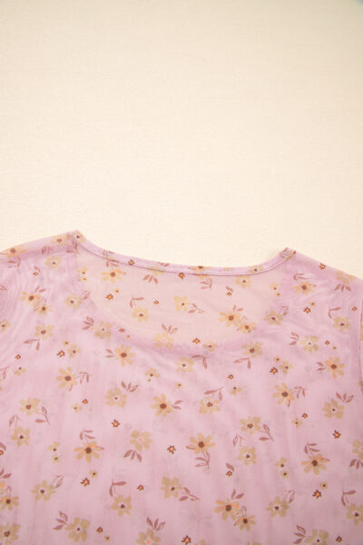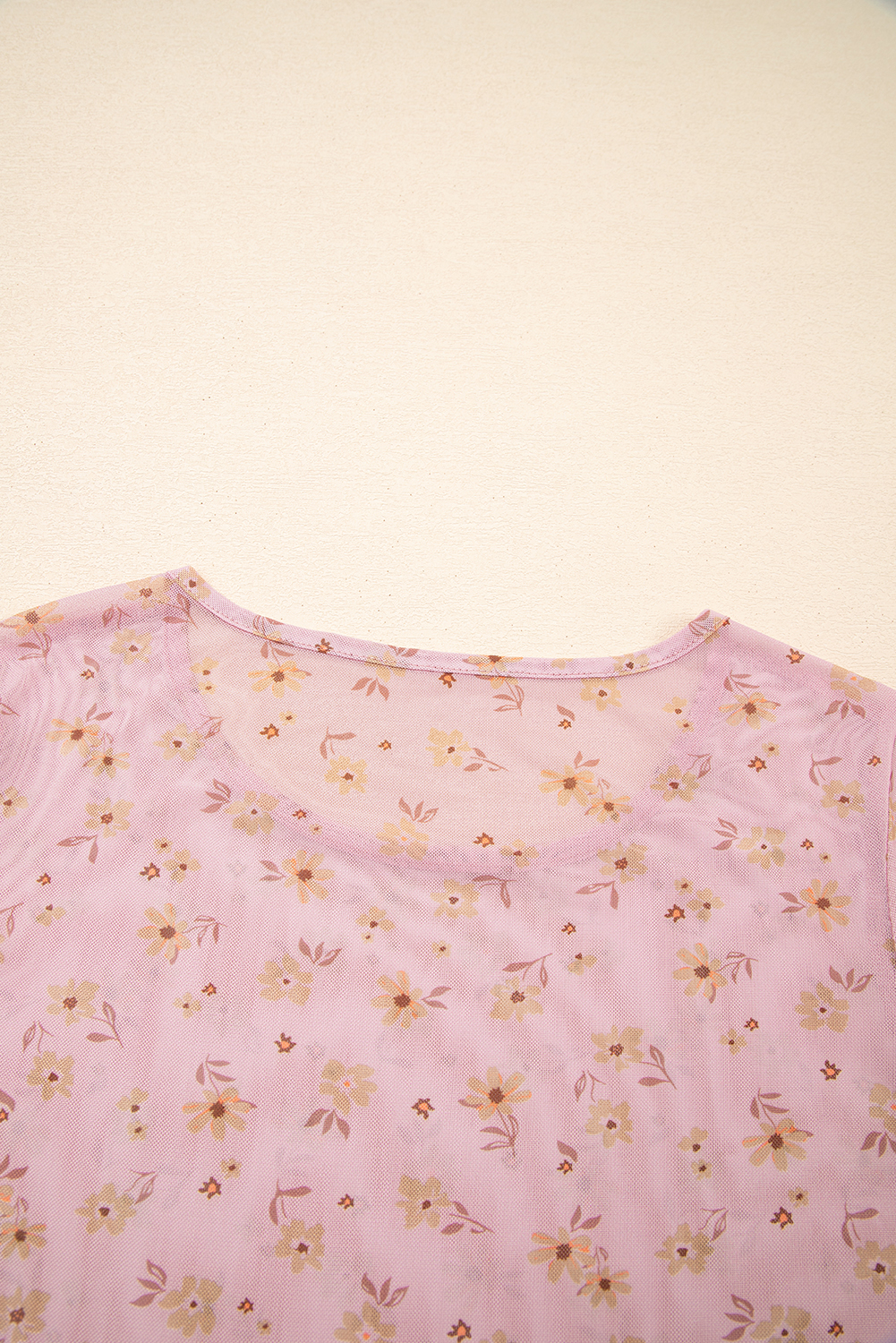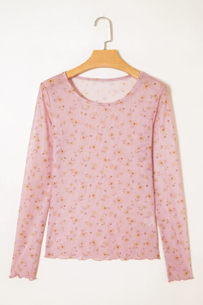 Pink Vintage Floral Print Southern Style Mesh Long Sleeve Top