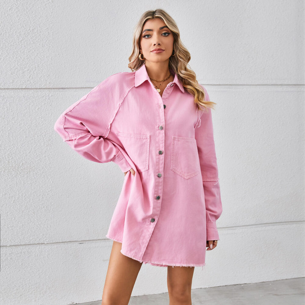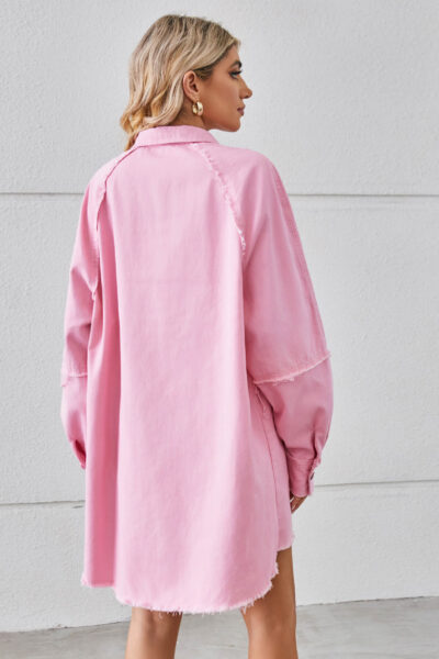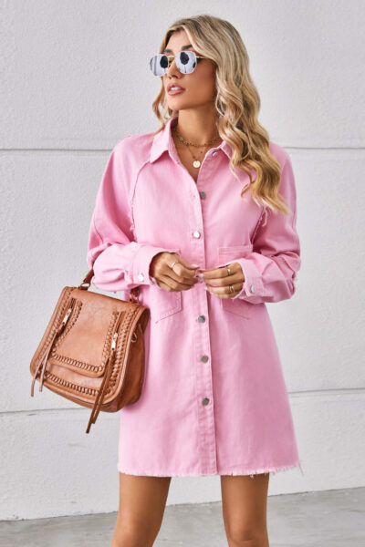 Pink Washed Frayed Denim Dress with Patchwork Long Sleeve