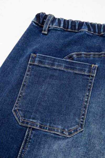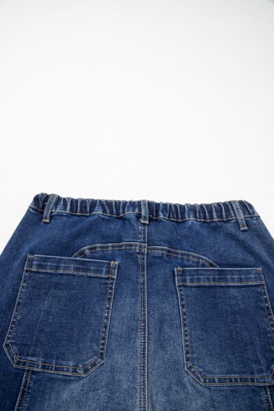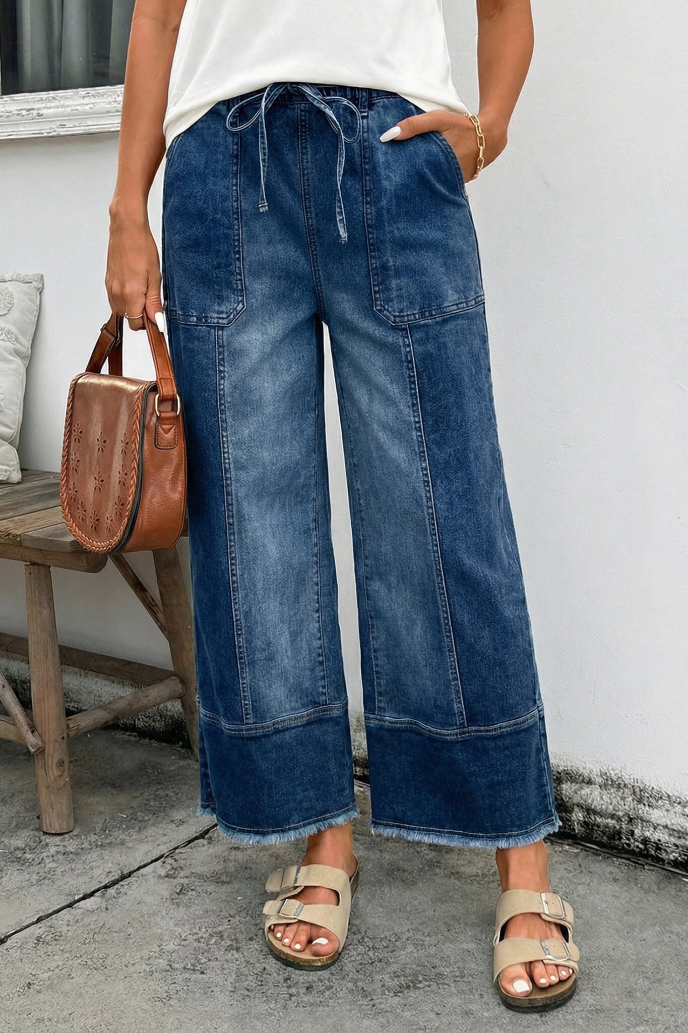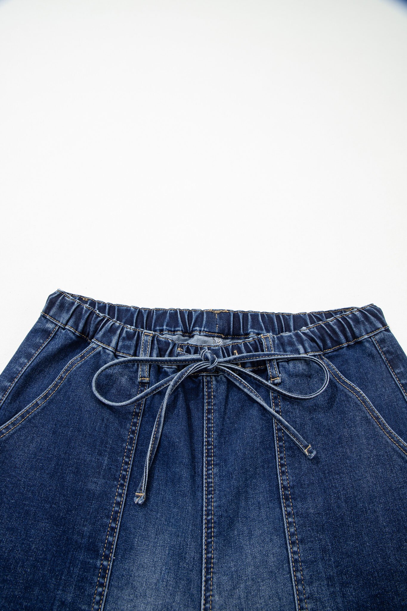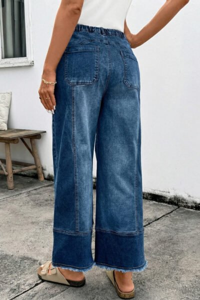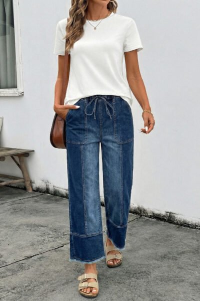 Prussian Blue Drawstring Seam Detail Raw Hem Wide Leg Denim Pants
