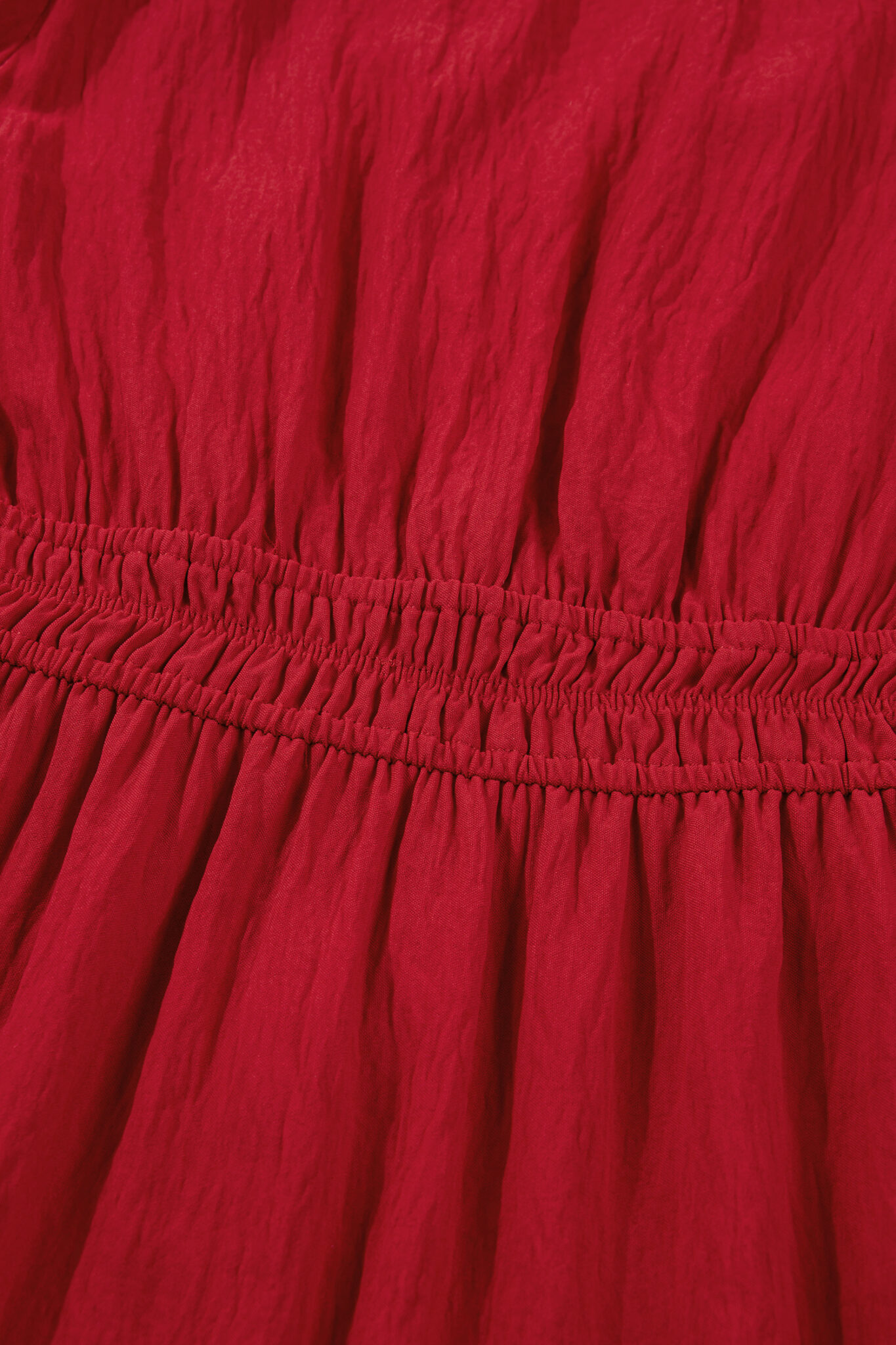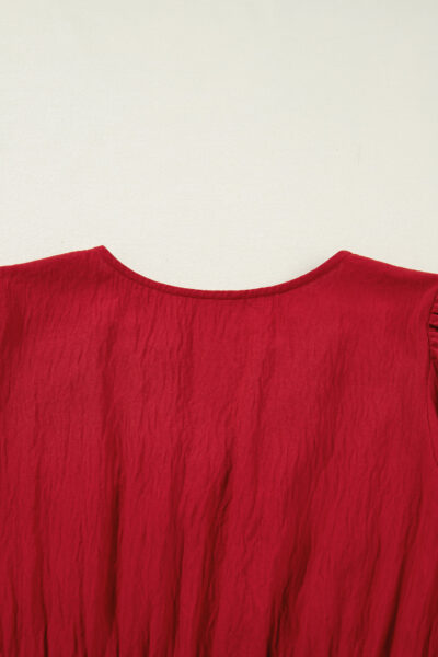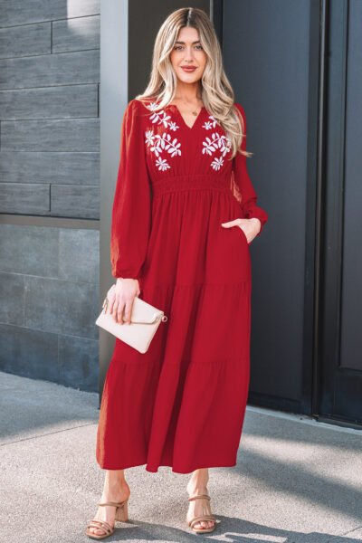 Racing Red Contrast Embroidered Detail Cinched Waist Tiered Long Sleeve Maxi Dress