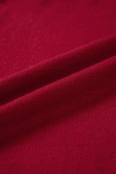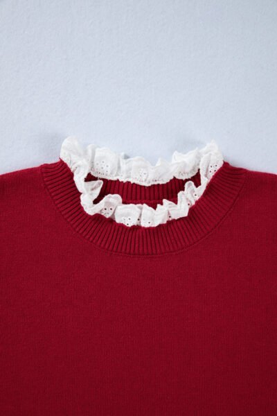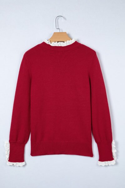 Racing Red Lace Trim Patchwork Buttoned Cuffs Loose Sweater