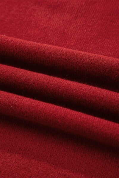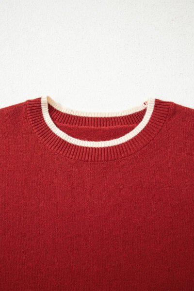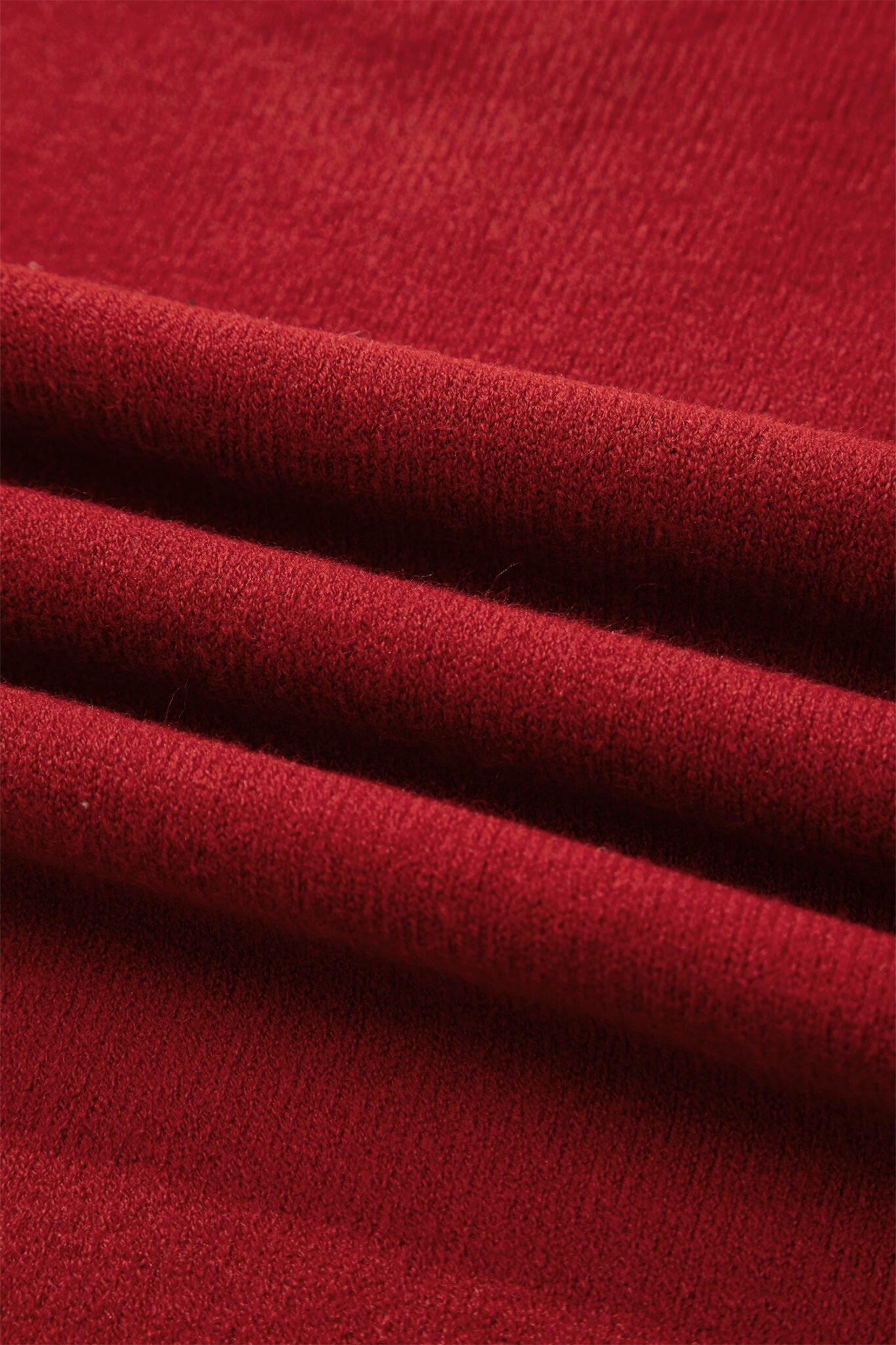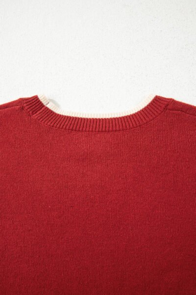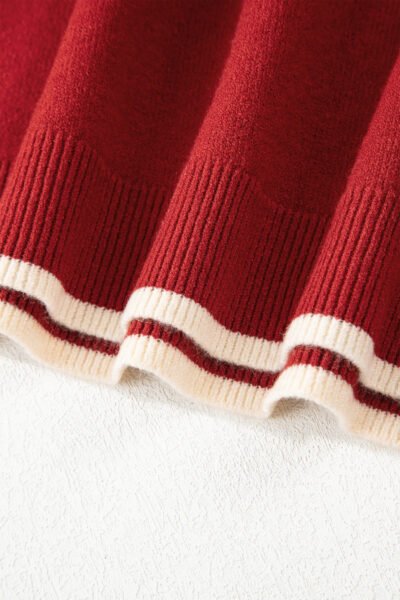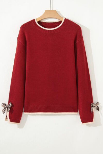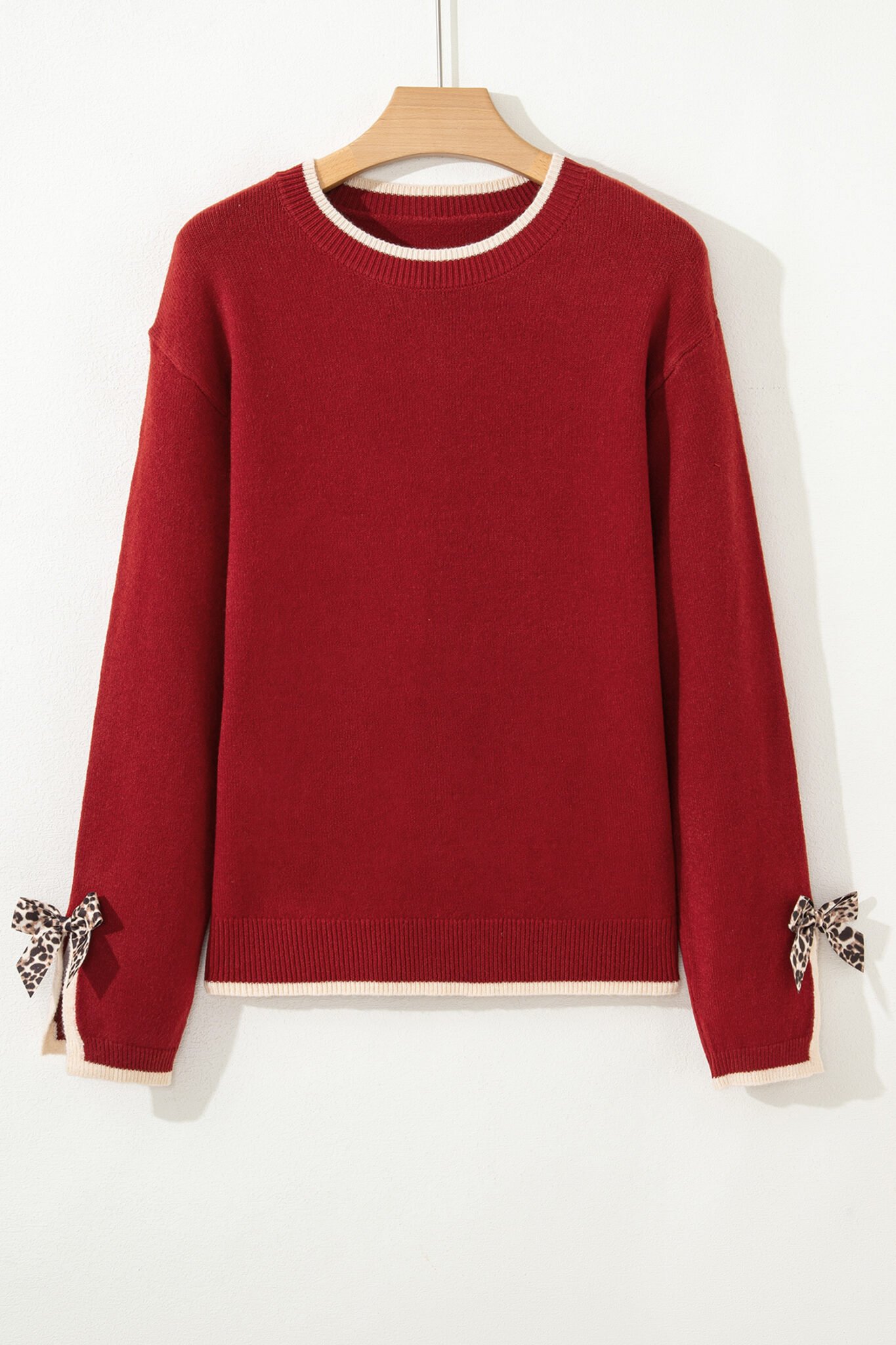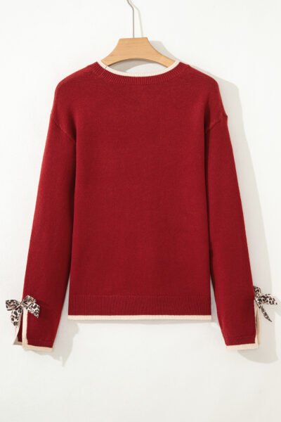 Racing Red Leopard Bow Decor Split Cuff Contrast Trim Sweater