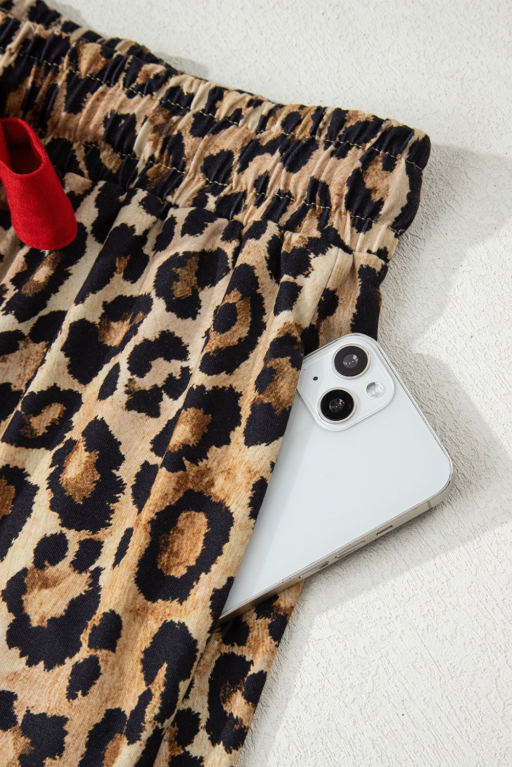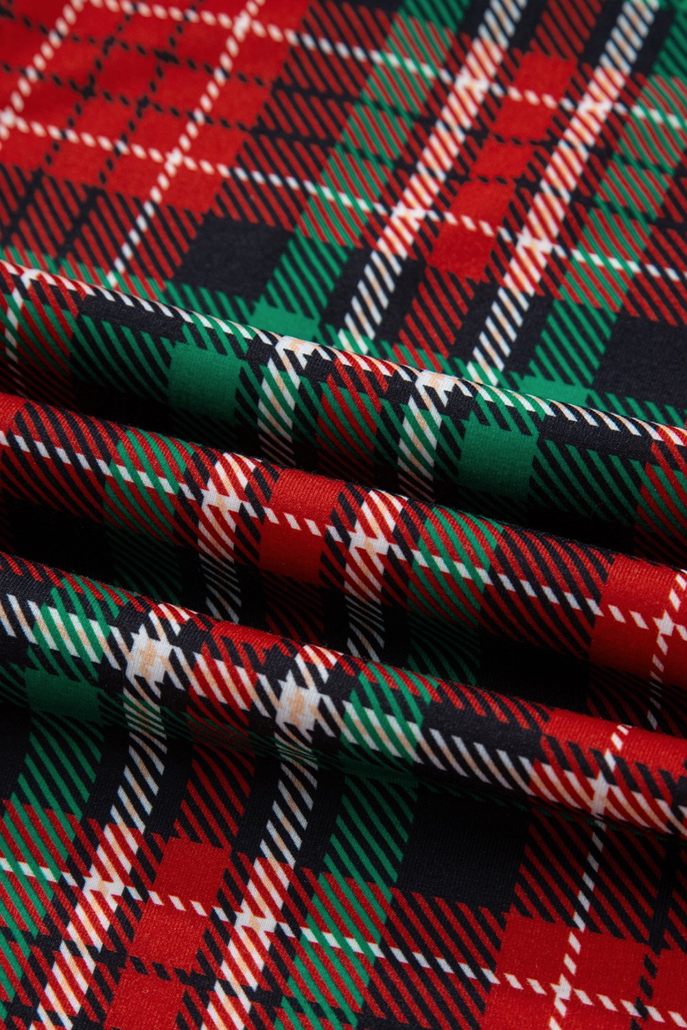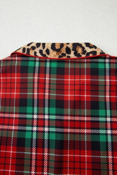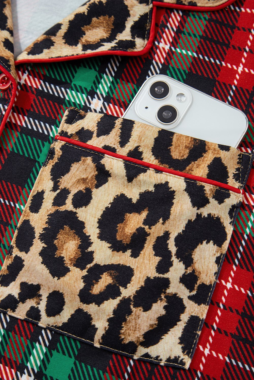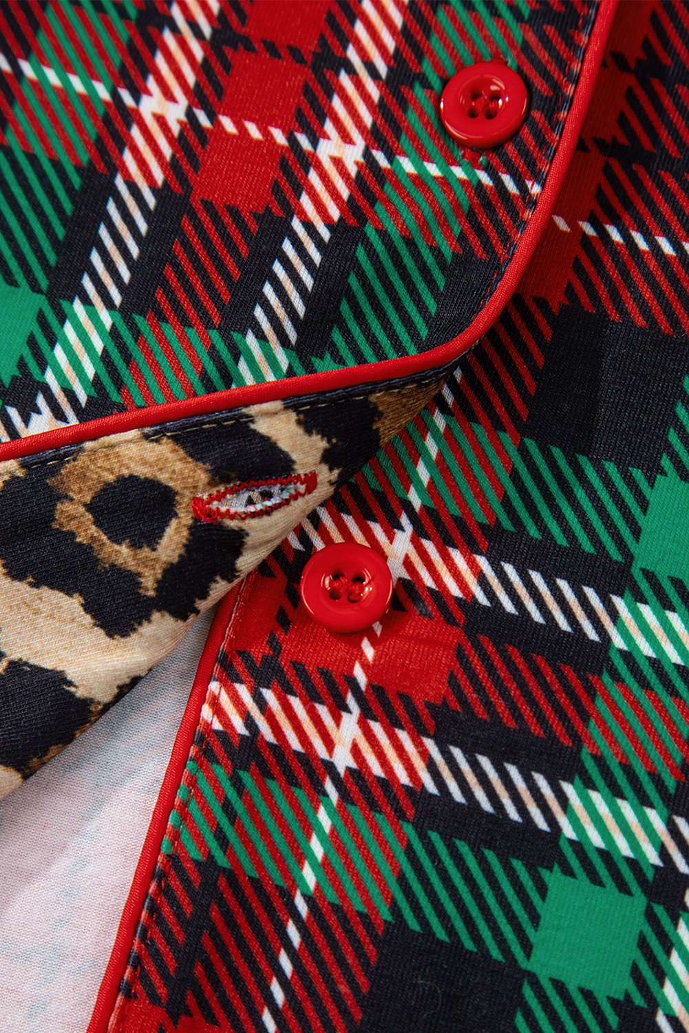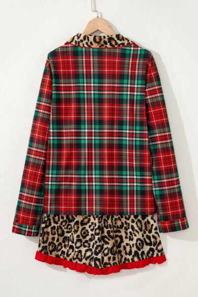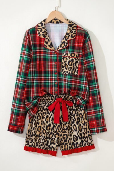Racing Red Retro Plaid Leopard Print Patchwork Long Sleeve Shorts Pajama Set