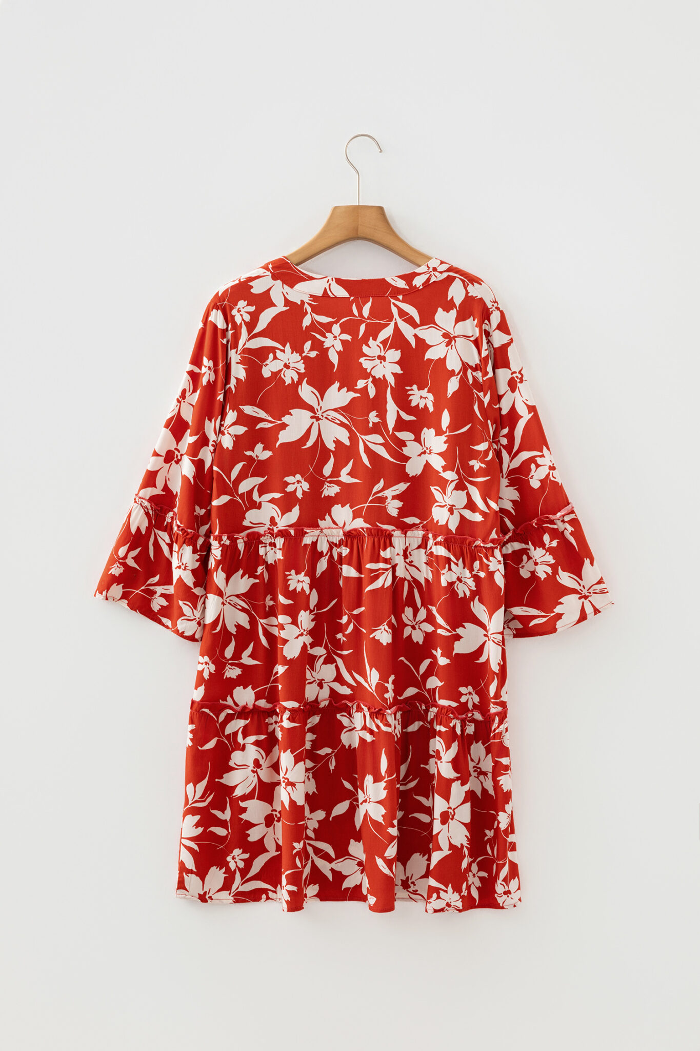 Red Boho Floral Print Lettuce Trim 3/4 Sleeve Mini Dress