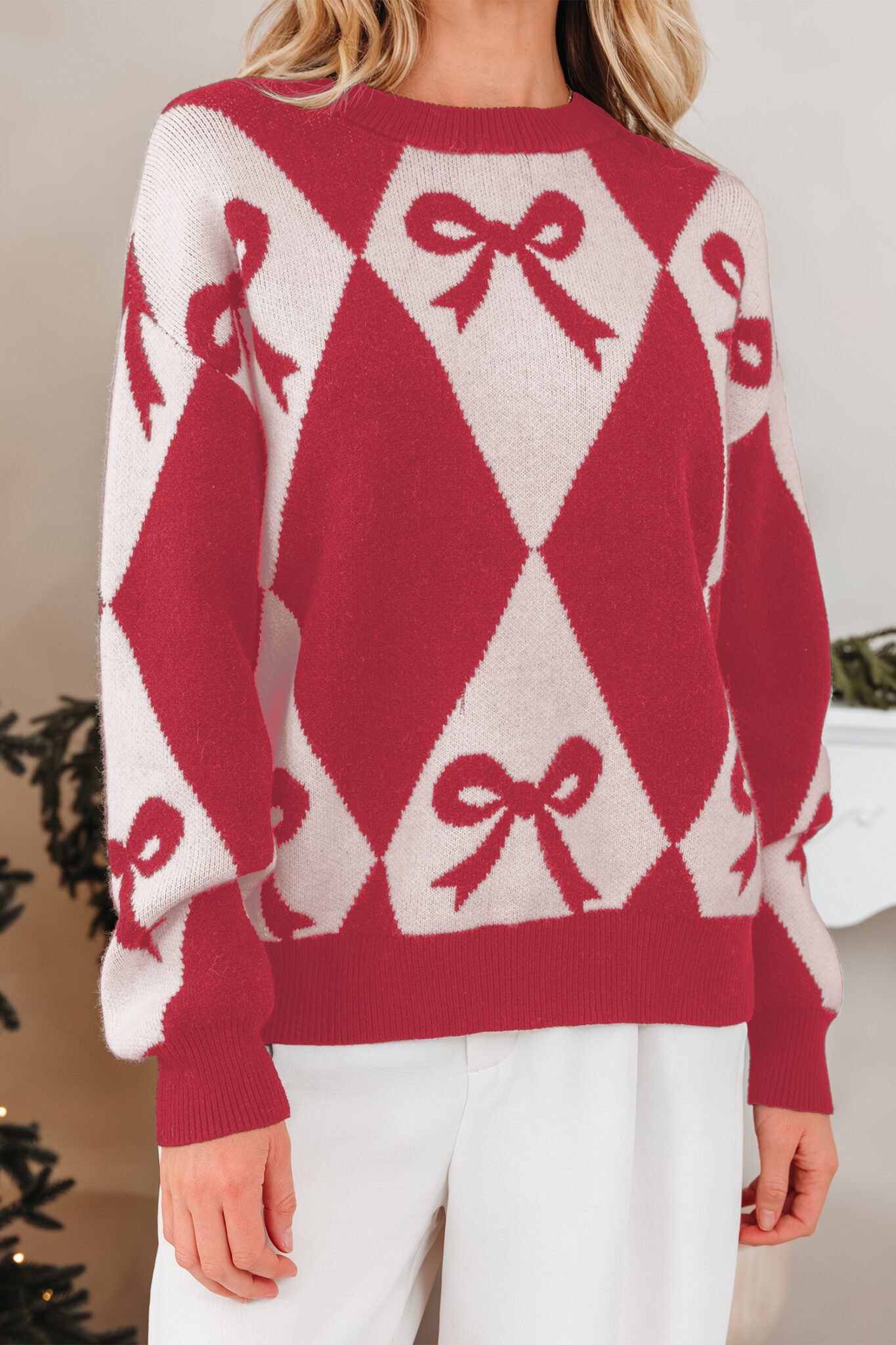 Red Bow Print 2-tone Rhombus Knit Loose Sweater